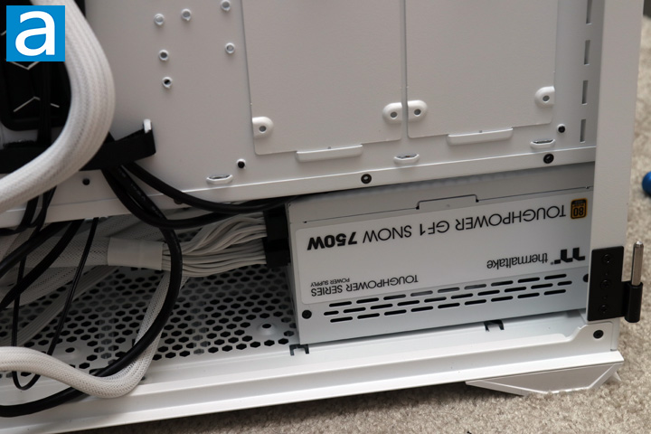 As always, I started my build with the power supply, which included plugging in the necessary cables, mounting the power supply in place, and routing said cables to the correct location. The power supply in question is the Thermaltake Toughpower GF1 Snow 750W, which measures 16cm in length. I definitely could have left the drive cage in the basement here, but as I had no use for it in my build, I removed it for a bit of extra cabling space. Thermaltake mentions a maximum length of 18cm or 22cm for the power supply, depending if you keep the cage in or out. I also routed all my cables through the case. Due to the white cables from the power supply, all of the cables really blended in nicely, which is probably the intention of the "Snow" editions seen across multiple Thermaltake products. I also routed the front I/O cables into the right spot at this point.