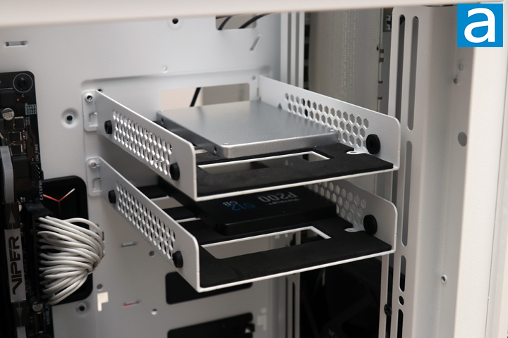 As for my own storage, I had two drives, the Patriot P200 512GB and OCZ ARC 100 240GB, mounted into the sleds inside the case. It was a pretty easy experience using the thumbscrews and putting them in place. I should note that you should be aware of where you end up putting these sleds. I originally had them in the bottom slots, until I realized they interfered with my graphics card. I then moved them to the top slot as shown in the photo above, until I later moved them down to make space for the tubing on my all-in-one liquid cooler, the Thermaltake TOUGHLIQUID Ultra 360. As such, you should be aware of these potential clearances when you are building in this system.