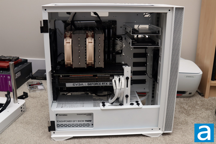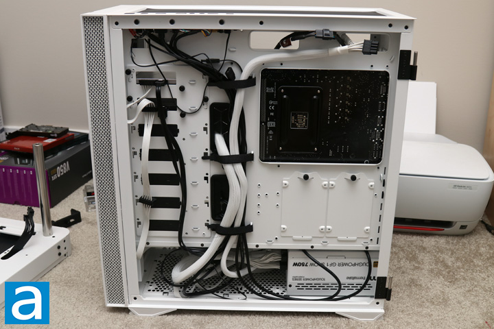 At the back, you can see how much room we have for thicker cables, while also having room in the basement to hide extra cables. There are a sufficient number of cabling hooks around the back and the three Velcro straps help collect even the bulkiest of cables. It also helps that the swinging door provides a bit of extra give to push cables into place when closed. Overall, I was quite happy with the build experience of the Thermaltake H700 TG Snow. There are a few things to keep in mind, especially with the drive sled placement and the video card bracket, but I found the case very easy to work in, while also easy to keep the finished product looking organized.