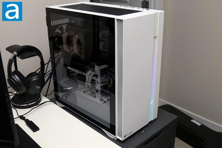With everything plugged in, I powered the build on and it came to life. The tinted tempered glass does still reveal everything inside, albeit with a darker look. Illuminated elements inside easily shone through, while hard to hide cables felt a bit more discreet behind this glass. I also really like the front addressable RGB LED light strip in the mesh, as it maintains the clean aesthetic, while adding a tasteful amount of color both outside and inside the case. In terms of noise output, our standard APH Networks sound scale ranges from 0 to 10, where 0 is silence and 10 is loud. I would rate the Thermaltake H700 TG Snow, at stock configuration, at a 3.0/10 under full load. The fans are pretty quiet and the case has a bit of foam dampening in areas to suppress noise from physical movement, but it does not do much to reduce noise from escaping out. Even so, this is pretty reasonable for a case in this price range.