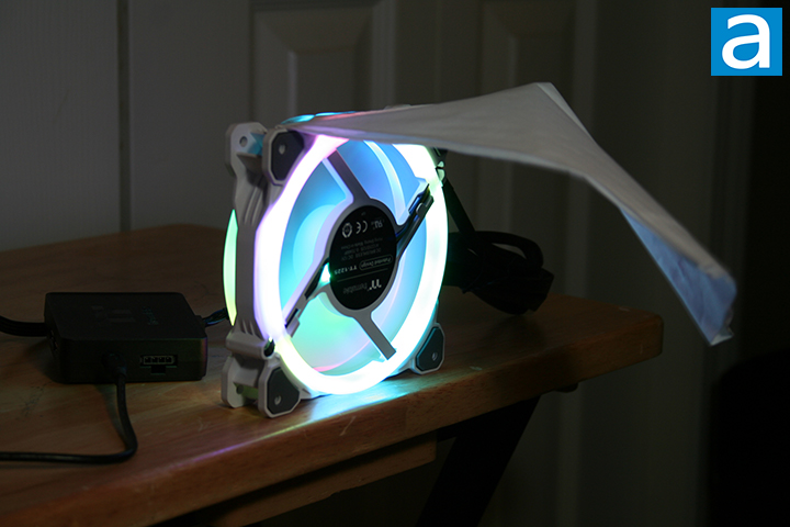 From the photos above, we can see the Thermaltake Riing Trio 12 RGB White was able to lift the tissue paper when in operation. The area of the tissue paper closer to the fan lifts fairly high while the rest of the tissue dips down noticeably at the end. It is good to see the Riing Trio 12 RGB White produced enough airflow and static air pressure to pick up the tissue paper, although it would be better if it was able to lift the entire tissue paper up at a taller height. However, this is also consistent with the specifications of the fan. The tissue paper held in place well for the most part and would only flap around a little bit with no dramatic movements. The tissue paper also sags a bit on the right side when viewed from the front. Both the airflow and static air pressure could be stronger, but ultimately, the performance is acceptable.