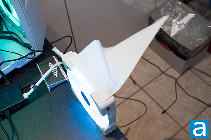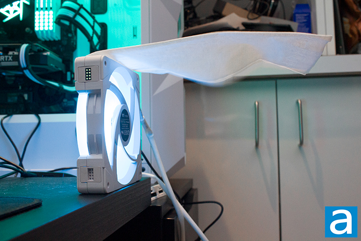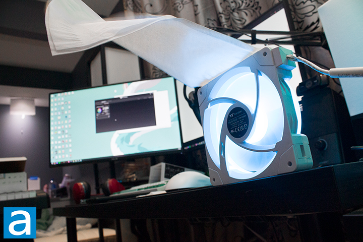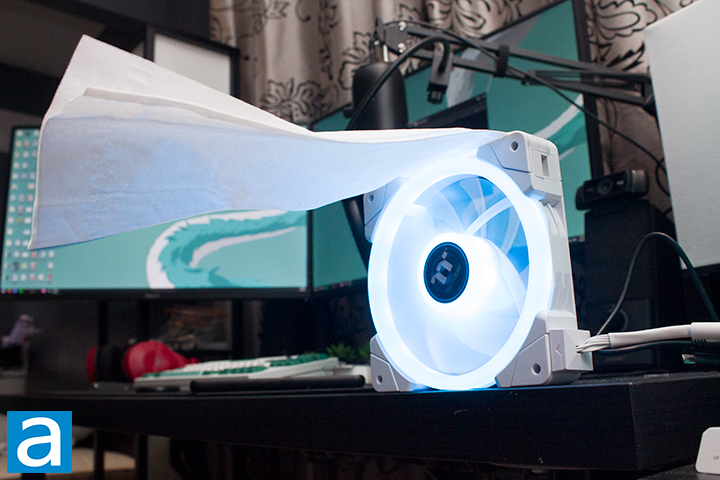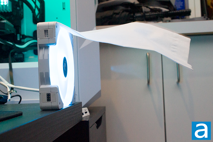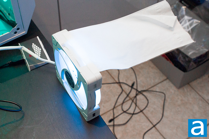 To test the performance of the Thermaltake SWAFAN EX12 RGB, our proprietary testing method invented right here at APH Networks was used. Although this test may not be the most comprehensive of tests, the results are qualitatively displayed at a minimum cost by using a piece of tissue paper and tape. As shown in the above photos, a piece of tissue paper was attached on the top of a fan. The tissue paper should be able to naturally fall down and cover the air outlet side –- the side where the motor rack is located –- of the fan. The fan is placed on the edge of a table to prevent air from reflecting off any other surface to not skew results. Once the fans were powered on, the airflow, airflow consistency, and the amount of static pressure can be evaluated by observing the behavior of the tissue paper.