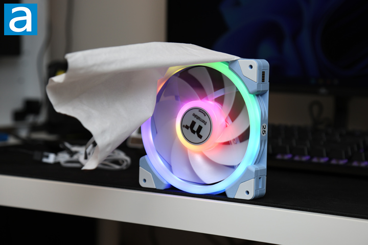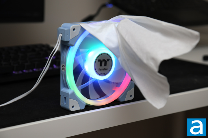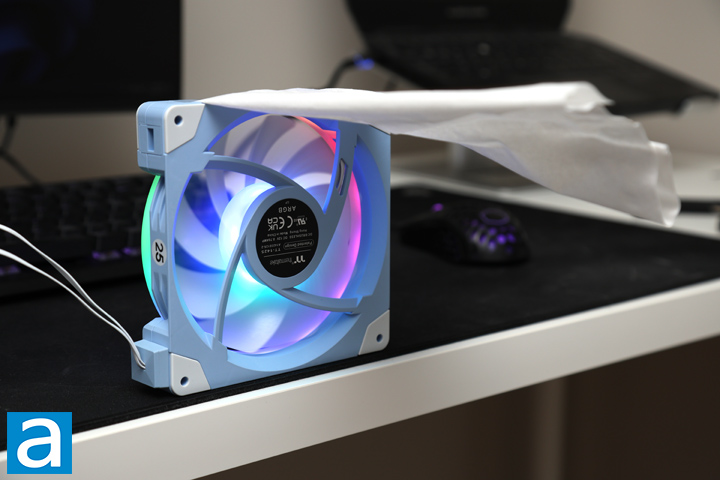 To test the performance of the fans, the APH Networks proprietary testing method invented right here at APH Networks was used. While it is by no means the most objective of tests, this allows you to test your fans at a minimum cost using a piece of tissue paper and tape. As shown by the above photos, a piece of tissue paper was attached on top of a fan. The tissue paper should be able to naturally fall down and cover the air outlet side -- the side where the motor rack is located -- of the fan. We have placed the tested fans near the edge of the desk to prevent air from the bottom surface from bouncing back, thereby masking the actual performance characteristics of it. Once the fans were powered on, the airflow, airflow consistency, and the amount of static pressure can be evaluated by observing the behavior of the tissue paper.