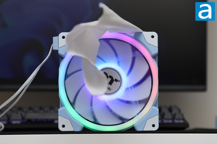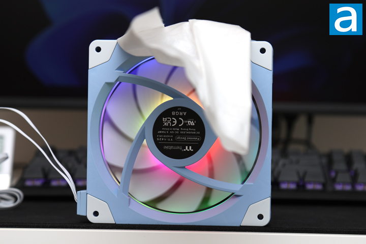 As we have two different impellers with a standard and a reverse flow direction, I analyzed our results for these fan blades separately. Starting with the standard blade, you can see how the tissue paper flies with a greater air movement on the left side of the fan, with respect to the photo. The back end of the tissue was not raised evenly. We also observed quite a bit of movement on the tissue paper during our tests, which indicated an inconsistent output airflow. Furthermore, while the tissue paper was raised all the way to the end, the dipping on one side of the fan also revealed poorer characteristics with regards to the airflow and static pressure generated from the Thermaltake SWAFAN EX14 ARGB Sync.