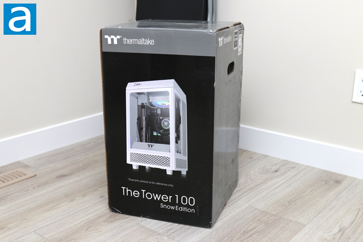 Today's review unit of the Thermaltake The Tower 100 Snow arrived from Thermaltake's offices in City of Industry, California. Traveling with UPS and their Standard ground service, this box arrived in decent condition with no real holes or dents to be too concerned about. As this computer case is relatively large, Thermaltake has shipped this box in its retail packaging. The retail box is pretty nice with a fully colored exterior. The front shows off a full build in The Tower 100 Snow, albeit in a scaled down fashion. The top shows off the Thermaltake logo and product name, while the bottom shows off the product name. I like the simplistic look of the overall box.
