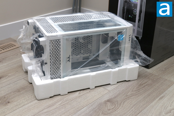 Out of the box, the Thermaltake The Tower 100 Snow comes packaged in a clear plastic bag. All of the glass panels have plastic wrap on the external sides to ensure the tempered glass is protected from scratches or other marks during shipping. The whole case is sandwiched between two large white foam brackets to further protect the large case. Otherwise, some documentation and installation information can be found in another resealable bag. There is not much else in this retail box, so let us take a closer look at The Tower 100 Snow.