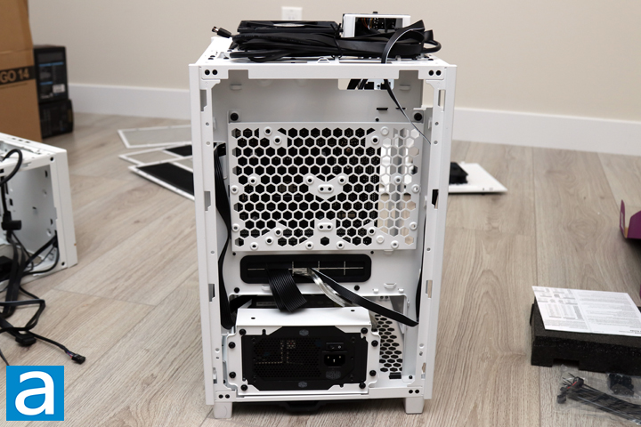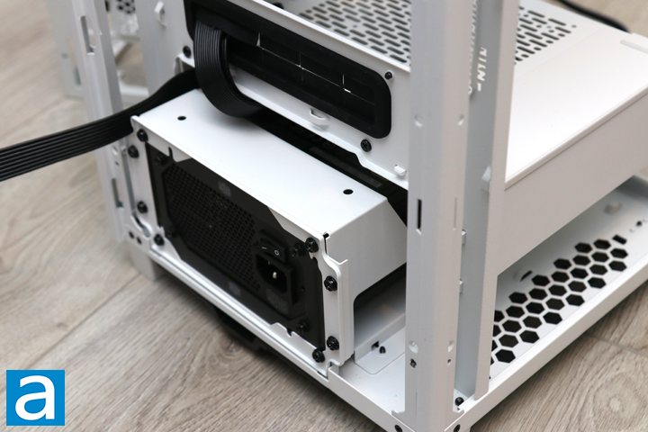 As usual, I started my installation process with the power supply, which allowed me to route the cables into the necessary positions before installing my motherboard. The power supply in question is the Cooler Master V850 SFX Gold 850W, which means I also used the SFX-to-ATX adapter included with the PSU. According to Thermaltake, users can install power supplies up to 180mm in length, which is pretty good for a case of this size. This does mean The Tower 100 Snow was made larger to accommodate these lengths, but I am still quite happy with the clearance here. I routed the 24-pin motherboard power connector through the black grommet, while the CPU 8-pin power connector was led to the side. Finally, I used a SATA connector to plug into my solid state drive.