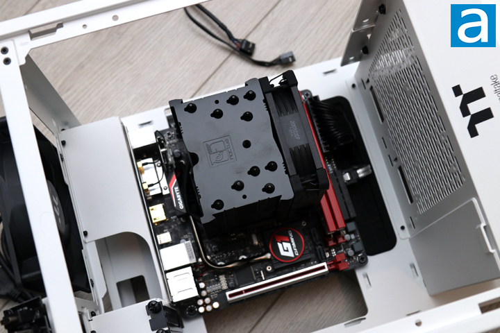 Inside, I installed the backplate for my motherboard and mounted the motherboard to the pre-installed standoffs. With all of the clearance around the motherboard, I had more than ample spacing to work in this area. I mounted the Gigabyte GA-Z170N-Gaming 5, which is holding an Intel Core i5-6600K under a Noctua NH-U9S chromax.black. The RAM on the motherboard is the Patriot Viper Elite PC4-24000 2x8GB. The Noctua NH-U9S, while it is not a large heatsink, looks small in the Thermaltake The Tower 100. Users have space to install coolers up to 190mm in height, which is quite a lot of space. Users can also install a 120mm AIO cooler at the top. While it is not seen in this photo, I also mounted the Gigabyte UD PRO 256GB to the side of The Tower 100 Snow. I also mounted my single-slot Elgato HD60 Pro, which is a capture card. This is a very small expansion card, but you can install video cards up to 330mm in length. For your reference, the most recent NVIDIA RTX 3080 Founders Edition measures 285mm in length. By length, The Tower 100 could hold an RTX 3090 if it were not for the triple slot design. Once again, it would have been nice to see support for a third expansion slot, since higher-end graphics cards seem to be getting chunkier by the generation.