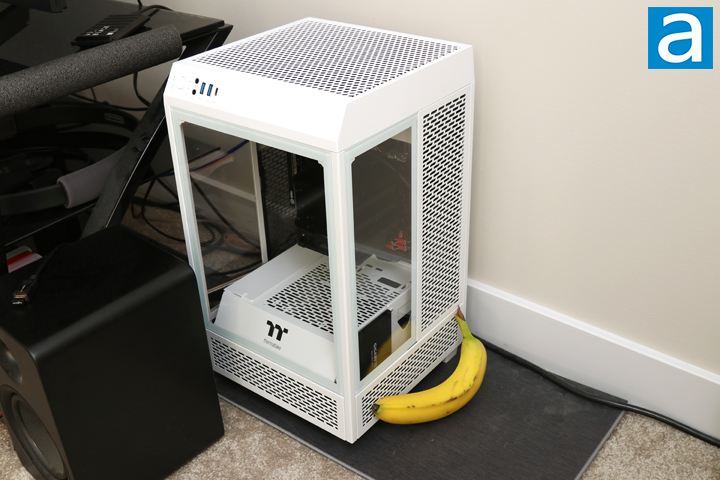 With everything plugged in, I connected the necessary outputs and routed them out the back of the enclosure and pushed the power button. My media PC flashed the blue LED light and everything powered on. As you can see, the banana shows a better scale of how much larger this is compared to some of the SFF computer chassis I have looked at recently, like the SilverStone SUGO 14 or Cooler Master MasterBox NR200. It does come down to the preference of what you may want, but I can see merits for both sides. With the system turned on and all of the fans spinning, The Tower 100 Snow is quite quiet. According to the standard APH Networks sound scale, where 0 is silence and 10 is loud, the Thermaltake The Tower 100 is 3.0/10 under full load. The rest of my components are quiet as my power supply fan does not spin normally and the 92mm Noctua fan is generally pretty silent on a day-to-day use. There is no form of noise dampening, but the included fans do not spin too fast and therefore stay silent.