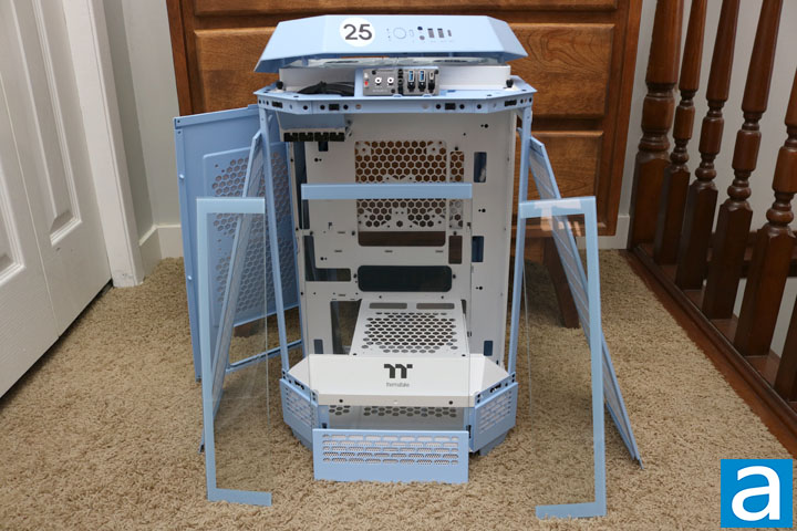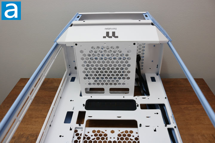 The top panel is clipped in and can be easily taken out by pulling it in and pulling it out. The tool-less removal of all these side panels make accessing the internals a breeze. Removing so many panels also makes installation a bit easier, since you can access the interior from multiple different angles.