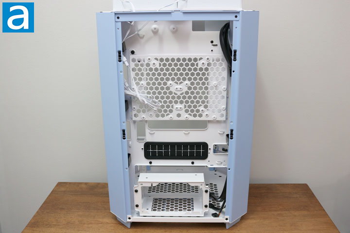 All the way at the bottom, we find the power supply basement. The case can accommodate a power supply up to 220mm. Accessing cables down here is a challenge, so keep that in mind. One more thing to note on the back is that the back panel can also accommodate up to two 120mm or 140mm fans. This also impacts how much room you have for cables in the back.