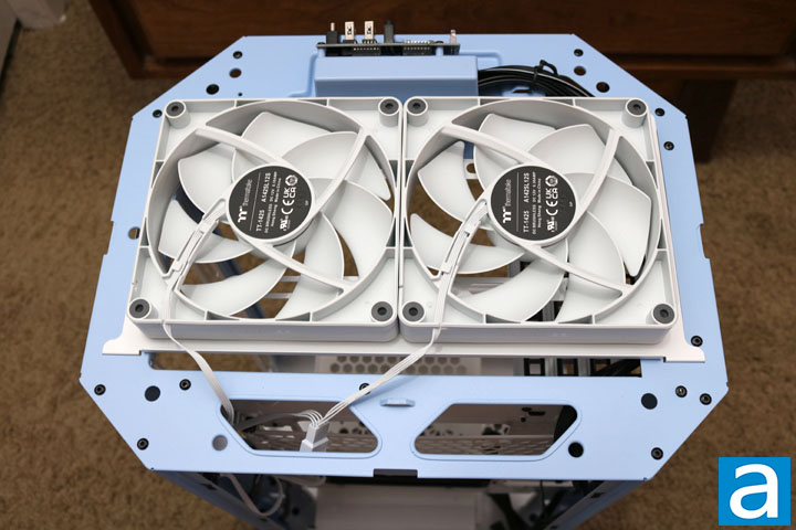 All the way at the top of the case, we find two pre-installed 140mm fans. Two 120mm fans can also be installed here. The ones that come with the case are Thermaltake CT140 hydraulic bearings fans, which operate at 12V and 0.17A. These PWM fans can speed up to 1500 RPM, providing 2.3 mmH2O in air pressure and 77.37CFM in airflow. They are rated at 30.5 dB(A) and are installed in an orientation to pull air out the top of the case.