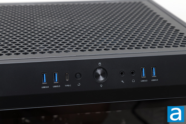 The front I/O of The Tower 500 can be found on the front facing edge. Starting from the middle, we have a large circular power button with a blue LED ring around it for power status. A red LED exists above the ring and it blinks to indicate drive activity. Moving outward, we have a reset button on the left side and two 3.5mm audio jacks for microphone and headphone connections. Next, we have all of the USB front ports, including four USB 3.0 ports and one USB Type-C port. While not all modern motherboards actually can support all four USB 3.0 ports, as it requires two internal headers, it is nice to see all of the connectivity options here. Otherwise, you can see at the top we have a large array of honeycomb holes. This is lined with mesh to prevent dust from landing through the top while also acting as the exhaust for this system.