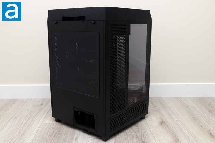 At the back, we have a few interesting holes to point out. First, we have a large cabling hole at the top of the case located behind the top plastic rim. It is actually divided into two parts, as a plastic pillar exists in the middle. This allows users to pass their cables to the motherboard back I/O, as you will see on the next page. Moving down, you can see two captive thumbscrews here to hold the back panel to the frame of The Tower 500. In the middle, we have a large cutout with a black plastic mesh lining. This mesh is held with magnets to allow for more ventilation here. At the bottom of the enclosure is a large opening for a standard size ATX power supply.