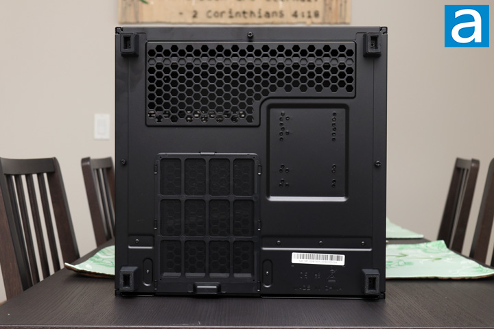 From this perspective, you can see how large the footprint of the Thermaltake The Tower 500 is, with its wide base. At each corner, a foot with a rubber square at the bottom prevents vibration between the case and the surface it sits on. We can see the three thumbscrews attached to the front and two sides to hold the bottom ventilation panels in place. Finally, we one plastic mesh tray that covers over the bottom of the power supply. Another ventilation area can be seen at the front of the chassis and is filtered with a magnetic mesh inside.