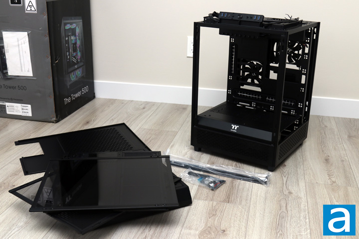 Unlike the smaller The Tower 100, taking off the side panels on The Tower 500 is a tool-less process. The first step is to pull off the entire top plastic frame, which is held on with just plastic clips. Afterwards, all of the side glass panels can slide off the top. The back and bottom panels are all held on with thumbscrews, although I found all of these screws were still overtightened. From this photo, you can see I only half removed the top panels, which was pretty easy to do so. All of the glass panels are held on with a metal frame so that you can hold onto the panel without leaving fingerprints. The glass panels are slightly tinted.