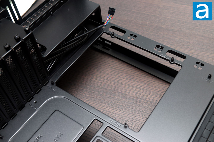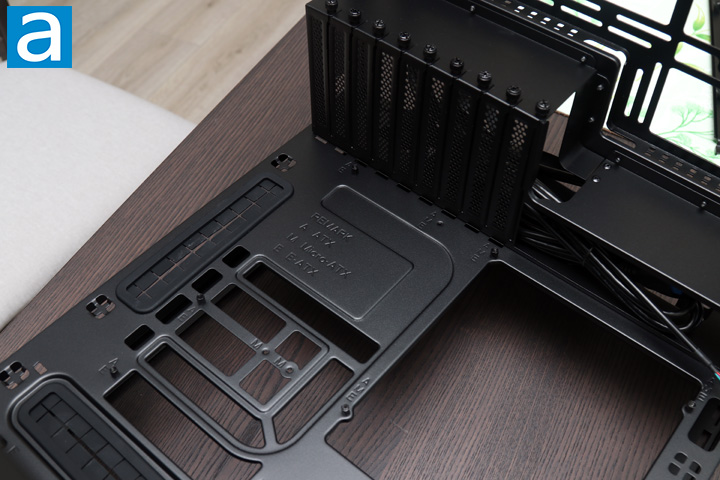On the flip side, you can see all of the expansion slots, which totals at nine. Down the back and bottom of the motherboard area, there are many holes here to allow for ventilation and cabling through here, assuming it does not get covered up by your motherboard. Routing holes can be found down the side and bottom, and are fully rubber grommeted to hide any unsightly cables. You can also see the front I/O cables sneaking through at the top, as they are all bundled here out of the box. All of these cables are sleeved in black, with the USB Type-C connection with a flat sleeve cable for easy handling and routing.