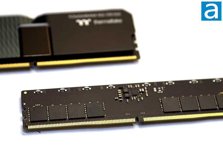 As you can see more clearly in our photo above, the Thermaltake TOUGHRAM XG RGB D5 DDR5-5600 2x16GB has a very nice black PCB. Thermaltake claims this is a 10-layer PCB with 2 oz copper inner layer for better overclocking performance. We can also spot the power management integrated circuit, commonly abbreviated as PMIC, near the center. Its heatspreader on top is composed of two separate pieces plus a plastic diffuser. It features a unique design, where the two separate pieces are placed on the module in a crisscross manner such that half the piece covers one side and the other half continues on to cover the other side of the module. This is done to achieve the cool 3D design in the center. The heatspreaders are held to the module itself by strips of thermally conductive adhesive and are not physically locked together. Instead, they are aligned by a notch near the middle. The adhesive force between the two heatspreaders and memory ICs is pretty strong, so if you ever do take them off, keep your hair dryer around. Additional strips of adhesive at the top hold the plastic diffuser in place.