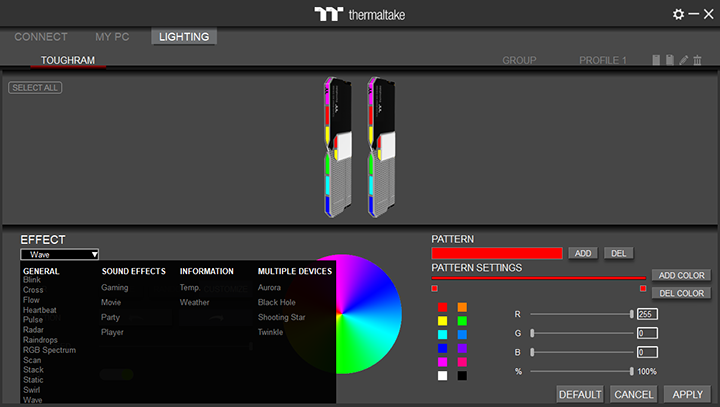 The main configuration window is separated into three tabs. The Lighting tab allows you to select the product you want to configure, which, in this case, is our TOUGHRAM. There is a great variety of lighting effects and configuration options, as shown in our screenshot above. If you do not want to use Thermaltake's software for configuration, the TOUGHRAM XG RGB D5 is compatible with all major motherboard RGB lighting control systems, including ASUS Aura Sync, Gigabyte RGB Fusion 2.0, and MSI Mystic Light.