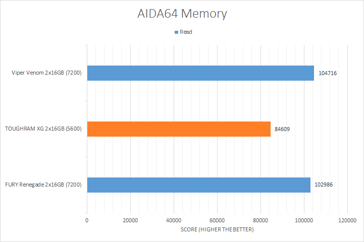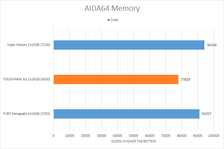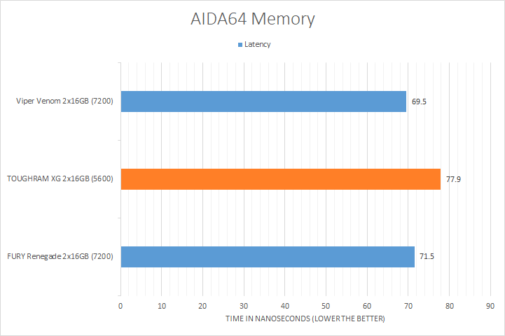 AIDA64's synthetic memory tests are the one next up to produce results for our review today. Traditionally, in pretty much all the benchmarks, see higher memory bandwidth RAM kits are generally favored, whether it is the Copy, Write, or Read results. Operating at DDR5-5600, the Thermaltake TOUGHRAM XG RGB D5 consistently came in at the bottom compared to the significantly higher clocked DDR5-7200 kits, which is not surprising given its rated speed. The Viper Venom was faster than the FURY Renegade at the same speed possibly due to the Viper Venom's lower latencies, which should not be a surprise when it posted the best score in the memory latency test.