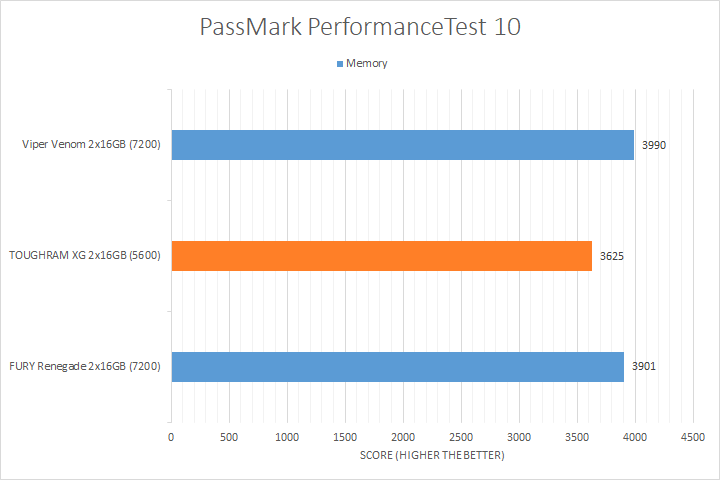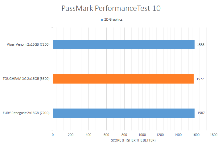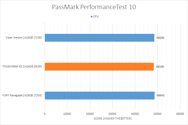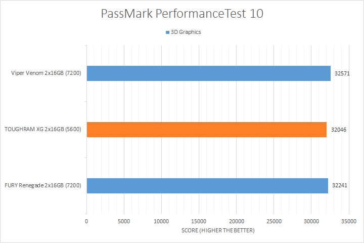 We run PassMark PerformanceTest 10 to evaluate four different areas of our system; coming down to the CPU, 2D Graphics, 3D Graphics, and RAM. It takes a somewhat different approach in obtaining results compared to other programs, which is why we like to use it, haha. PassMark Performance Test 10's memory benchmarking tool is the only test in our setup that takes memory capacity into account, but it does not seem to account for anything above 16GB from our past experience. The memory benchmarking tool did account for the extra bandwidth, so faster RAM performed better. Unsurprisingly, the two DDR5-7200 kits took home clear wins, with the Thermaltake TOUGHRAM XG RGB D5 DDR5-5600 2x16GB coming behind the Kingston and Patriot kits. Other than that, the CPU, 2D Graphics, and 3D Graphics tests were generally reasonably close between kits.