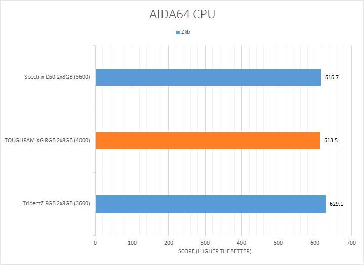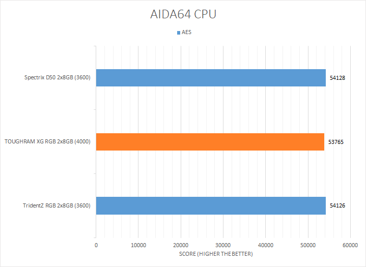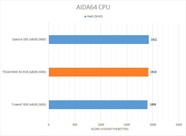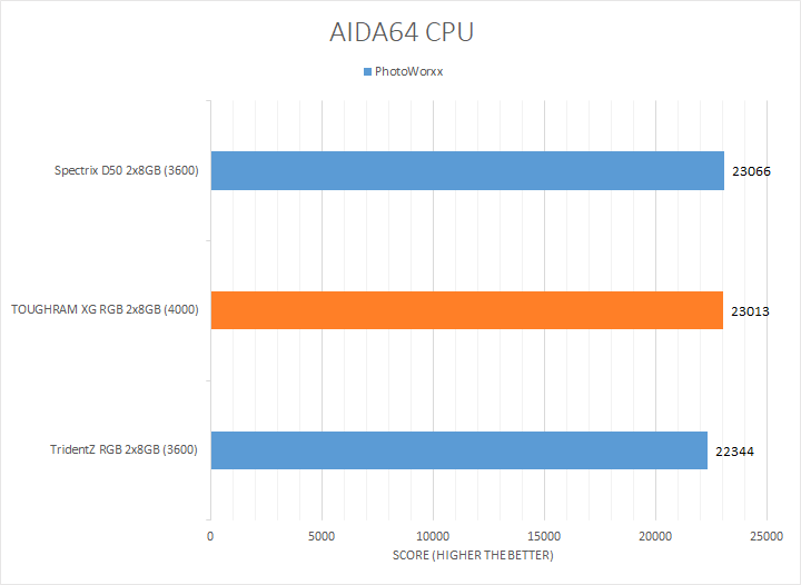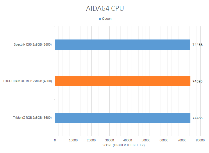 Our first set of benchmark results presented on the table are data obtained using AIDA64 Engineer's CPU tests, as per regular APH Networks procedure. Right off the bat, we can see the Thermaltake TOUGHRAM XG RGB DDR4-4000 2x8GB’s CPU scores are on par with the G.Skill Trident Z RGB DDR4-3600 2x8GB and the XPG Spectrix D50 DDR4-3600 2x8GB. The TOUGHRAM XG RGB came out on top in the Queen test, while the other results either fell in the middle or back of the pack, showing the combination of a higher operating frequency with higher latencies is not always more advantageous. All the results were within a percentage or two of each other, which is a trend that will continue to pop up in many of our tests.