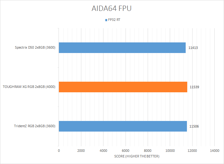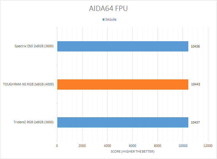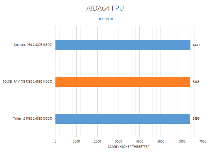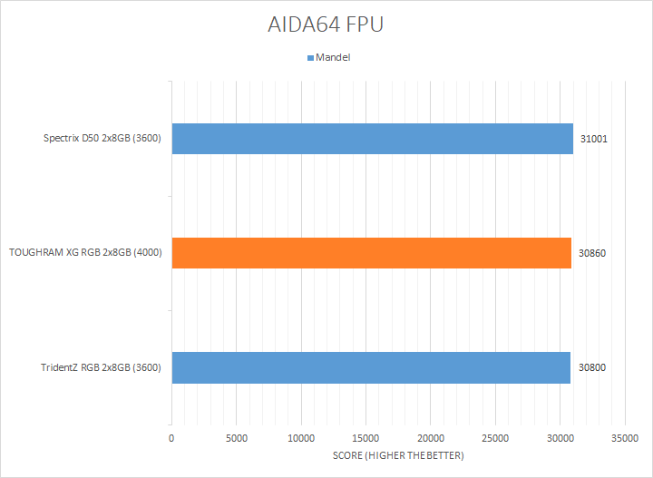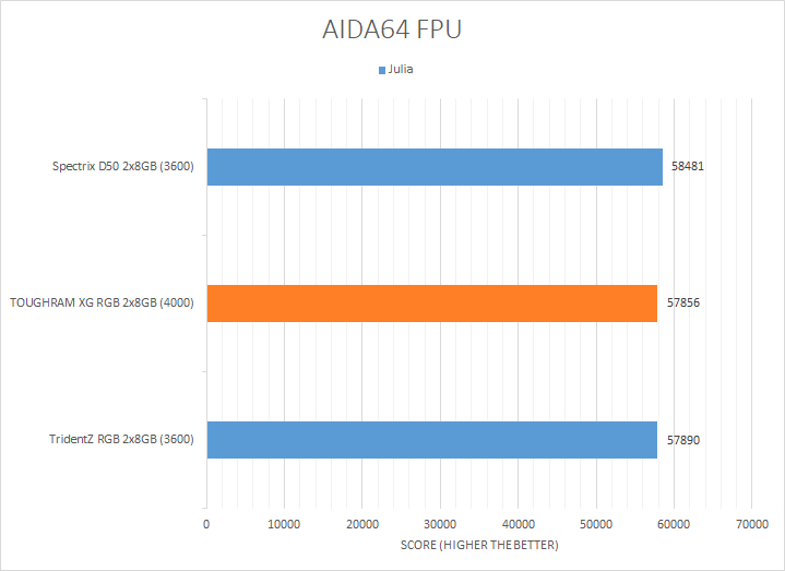 As seen in other memory reviews, floating-point unit benchmarking is usually not the most exciting set of tests to run. This is because these tests are mostly dependent on the test system's processor, so parameters such as RAM latencies or clock speed ultimately do not make a huge difference. This is further proved by the results, where the three memory sets had very little differences in scores. The Thermaltake TOUGHRAM XG RGB DDR4-4000 2x8GB came out just barely ahead in the SinJulia and FP32 RT tests, but again, the difference here is essentially negligible. It is unfair to make a strong evaluation of the TOUGHRAM XG RGB based on these benchmark results alone, so let us move on to the more relevant memory benchmarks.