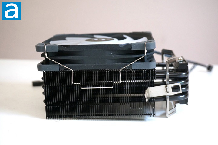 There are two rows of heatpipes, slightly offset relative to one another, parallel with the fan mounting surface of the heatsink. The layout of the heatpipes of the Thermaltake UX200 SE allows the heat to be evenly distributed to the fins. From the above picture, you can see the fan is attached to the UX200 SE's fins by using wire clips. There are two hooks on the wire clip for the fan, and a tab in the middle of the wire clip for easy attachment to the main tower. This mechanism is simple, lightweight, works well, and has been popular with tower heatsink designs for a long time now.