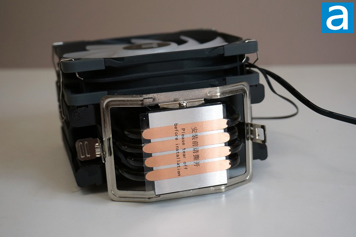 Let us move on to take a look at the base of the Thermaltake UX200 SE. Thermaltake made this base out of aluminum and copper. More specifically, all the heatpipes are made out of copper, and you can easily see the four direct contact heatpipes embedded in the aluminum base. The quality of the base is pretty good, but I think it would better to be electroplated with nickel to protect the copper part of the base from oxidation. The contacting surface feels smooth after the protection film is removed. With the help of the provided thermal paste, heat can be smoothly transferred from the CPU to the cooler. All four continuous heatpipes are firmly soldered to the base. Also, the fins, which are crucial components for dissipating heat, are firmly attached to the heatpipes. Therefore, the whole cooling system is sturdily built, and it allows the Thermaltake UX200 SE to cycle through the evaporation-condensing procedures for years to come.