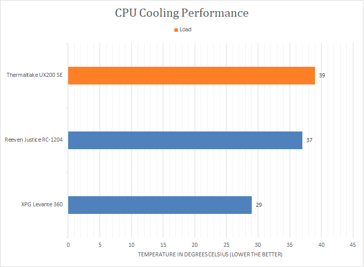 The real challenge happened when the CPU was under load. Along with the increased processing speed of the CPU, the fans spun up to match the extra heat generated. After about half an hour, the Thermaltake UX200 SE kept the temperature constant at 39 degrees Celsius. Today’s review unit was outperformed by the RC-1204 by 2 degrees Celsius and by the XPG Levante 360 by a much larger gap of 10 degrees Celsius. The UX200 SE only utilizes one cooling fan on the heatsink compared to the triple 120mm fans on a radiator for the Levante 360, so this is expected. Meanwhile, the use of liquid and a radiator also increased the efficiency of cooling system. The Reeven Justice is a solid cooler in of itself with more heatpipes and larger surface area comparing to UX200 SE. As evidenced here, the Thermaltake UX200 SE can deliver reasonably good cooling performance on modest CPUs.