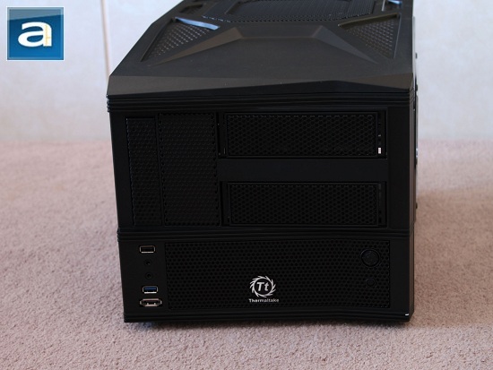 The front panel is divided into two simple sections -- the top half and bottom half. The top half consists of two 5.25" drive bays, which occupies two-thirds of the right side; while a 3.5" bay sits vertically on the left side. Right below the 3.5" bay, you can find an USB 2.0 port, 3.5mm audio jacks, an USB 3.0 port, and an eSATA port, in that order. To the right is a metal mesh with Thermaltake's logo in the middle. If you look closely here, there is a dust filter right behind, used to prevent dust from entering your system -- due to the fact that there is a front mounted fan right behind this area. You will be able to see it clearly on the next page. On the far right side of the bottom half, you will then find a power button, as well as a reset button right underneath the power button. Thermaltake keeps the front panel design very unique yet simple in my opinion. The bottom half seems like it is dented in more on the right side, with its left and right side slightly sticking out.