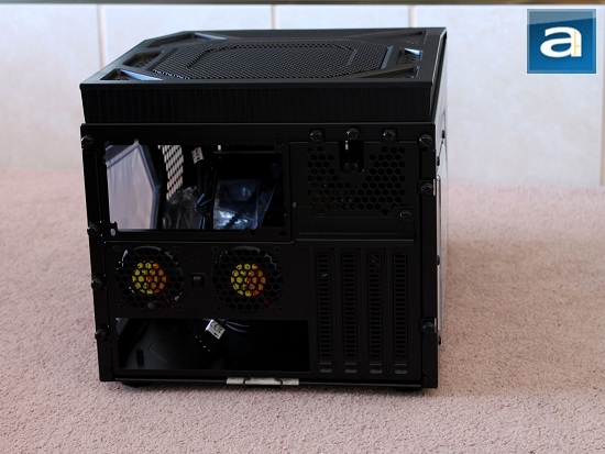 Much like the front panel, the back panel is divided yet again into both top and bottom halves. We are presented with a total of eleven thumbscrews on three of the four edges. Three of which hold the top panel in place, one locking the plate that covers the expansion card slots, one secures the removable power supply bay, and the rest are for the removable motherboard tray. On the bottom half, there is a standard opening for the motherboard I/O backplate. Just above that are two small 60 mm rear exhaust fans; followed by four ventilated expansion slots on the right. As aforementioned, there is a little plate that covers up the expansion card slots tightened in with a thumbscrew. Above the expansion slot area are more ventilation holes yet again. Last but not least, in the top left corner, is the power supply opening.
