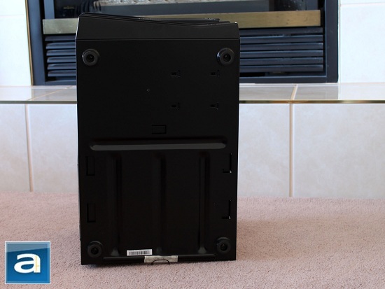 The bottom of the Armor A30 is actually quite simple. Here, we are not greeted by the standard bottom ventilation, because as you can see from the previous photo, the power supply is mounted near the top. What you will see, however, is that there is a groove right across the middle -- which looks like someone has decided to dig a trench to separate the case into front and back halves. You will soon find out this is used to support the end of the removable motherboard tray. Of course, there are also four round plastic feet at each of the corners of the case.