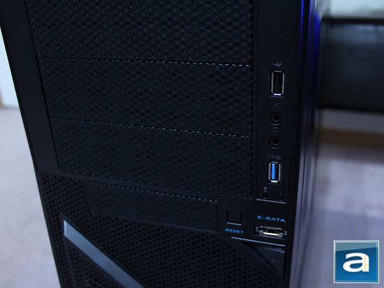 Here, from the image above, we can see more clearly that there are three 5.25" and one 3.5" externally accessible drive bays with mesh blank covers. Thermaltake ensures that dust will not seep into the computer by using dust blockers when drives are not installed. The usual array of connectors and case controls are situated on the right side of the drive bays. As we can see, from the top down, we have a standard USB port, two standard 3.5 mm audio jacks, one USB 3.0 Superspeed port, red hard drive activity LED, blue power indicator LED, as well as an eSATA port and a reset button just above the power button. One thing I would prefer Thermaltake to do is to recess both the reset button and power button, just in case of accidental engagement -- like the Armor A90.