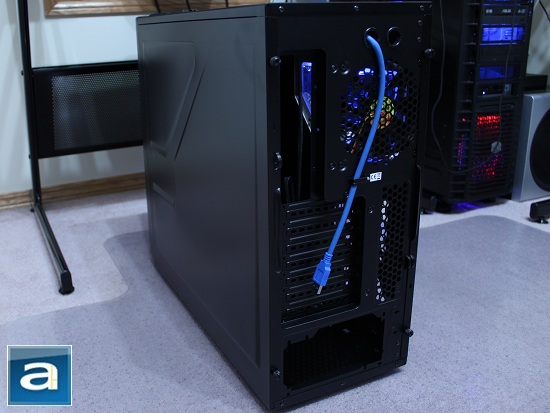 Shifting our attention to the back and right panel, I have noticed that both side panels are held in place with two thumbscrews each. Thermaltake even goes as far as covering the minute details, such as fully painting the inside of the panels and the ventilation plates for the expansion slots black. I would have expected them to have left them in their original metal color, so these minor details gave me a small surprise. As shown in our photo above, there are also two pre-drilled holes for water cooling near the upper perimeter. I used it for routing the cable for the front panel USB 3.0 port instead, which can easily be hooked up to the back of your motherboard's USB 3.0 port, where available. Four rubber feet are installed to accommodate the fan on a bottom mounted power supply. A locking feature is also provided for the left panel if you ever feel the need to have it secured.