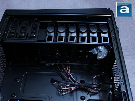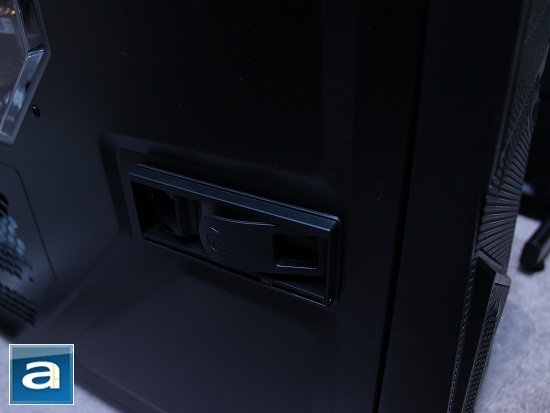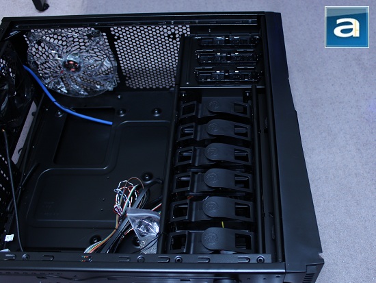 The Thermaltake Armor A60 can accommodate up to seven 3.5" drives. A 4-pin Molex powered 120mm LED fan installed at the bottom draws cool air over the hard drives and into the system. Since there are two fan mounts in front, it could easily be bumped up one slot to the one on top of where it is now. All drive bays are stacked parallel to each other, and can easily be removed once the wiring is detached from the opposite side, since the rack is turned 90 degrees to face outward. This greatly improves the neatness of cabling, since many of your cables can be hidden behind your drives. The top 3.5" drive bay is externally accessible for flash card readers or floppy disk drives (If you still use those), whereas the bottom bay has four bumps to support one 2.5" hard drive or SSD. Six of the seven 3.5" drive bays feature convenient slide-in tray installation; pulling out your toolkit would be a great idea if you do not have it by now -- you will need to attach a couple of screws. Out of the six bays, the top one is Thermaltake's SideClick EasySwap bay. I will be explaining this in more detail in just a moment. Meanwhile, installed drives can be pulled out quite handily by squeezing both sides of the drive bay tray. There are also are three externally accessible 5.25" drive bays near the top. Its tool-free installation implementation works by simply unlatching the clips and swinging it upwards, you can easily slide the device in and clip it back to its original position. For stability and secure installations, I would still recommend the use of screws.