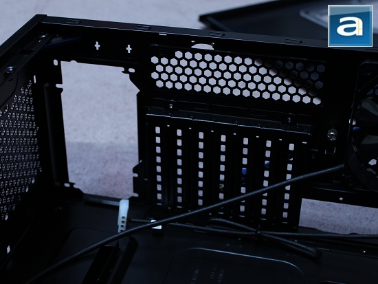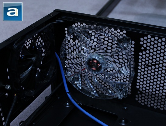 Here, we can see the rear 120 mm TurboFan (16dBA @ 1000rpm) in conjunction with the top 200 mm blue LED fan (15 dBA @ 800rpm). Keep in mind that the rear 120mm fan is the only fan in the system powered by a 3-pin motherboard header; the rest are LED fans with 4-pin Molex connectors. As aforementioned, the opening at the top will introduce more dust into your system. Also, you may have noticed the thumbscrew right under the 120 mm fan. This correlates to the clip on the back panel used for clipping down cables, such as those from your keyboard and mouse, to discourage theft of your peripherals at a LAN party.