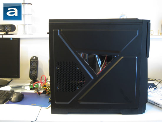 On the other hand, if you do not recall my take of what I believe to be the attributes of an optimal computer case, flip back a page and read it again in the introductory paragraph. While the Thermaltake has done a commendable job in keeping the design consistent across the board (Especially the visually appealing front face), the deal breaker for me personally is the way the crucial left side panel is put into practice. Embossed into the SECC side panel is a series of trapezoidal shapes, and a triangular window near the center. Why they made it as small as shown in the photo above is beyond my understanding -- mainly because it doesn't do a very good job at showing off your internal components, other than a little more than a glimpse at a section of your large tower heatsink. Additionally, I have personal issues against side panel fans. Firstly, the openings are usually ugly; and the ones on the Armor A90's side panel is no exception. Secondly, they allow more dust into the system, which is quite an inconvenience for lazy people like me. Thirdly, it poses no true performance advantage, rather than being merely a band-aid solution for inadequately cooled add-on cards -- I have built and used high performance systems with good aftermarket fans and never had any problems with heat or noise. All you need is a properly designed airflow pattern (Ie. Front to back pressure), and this is normally more than sufficient. Plugging in extra fans will obviously increase airflow, but it distracts regular pressure patterns to provide marginal temperature decreases with significantly more noise.