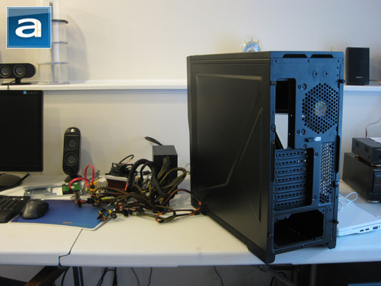 Shifting our focus a little bit, we can expectantly spot an included 120mm fan placed adjacent to the motherboard I/O backplate, with two pre-drilled water cooling holes close to its upper perimeter. Two air slots are situated near the top of the case for easy removal of the that panel. A half-inch raised platform from the bottom surface is implemented to accommodate a bottom mounted power supply, and a second set of water cooling holes can be found here. If you ever need to lock your left side panel, there's a place for that too.