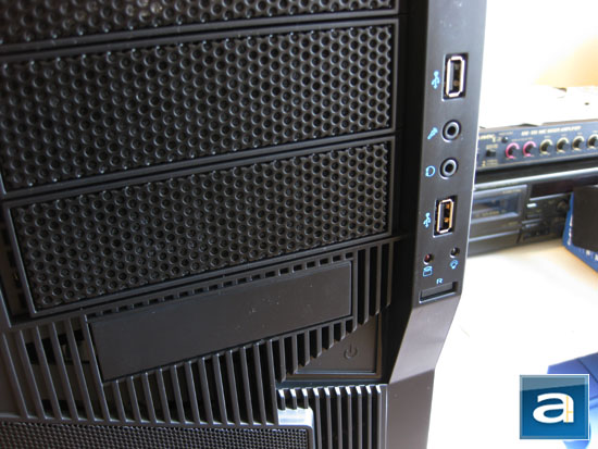 Swinging open the left hinged case door are three 5.25" and one externally accessible 3.5" drive bay. Every 5.25" drive bay cover are mesh based, therefore fully ventilated to allow air to pass through for improved ventilation. Unlike most cases in this category, however, Thermaltake added a nice touch in making sure incoming dust is kept at bay -- pun intended -- so the user can spend less time cleaning the interior of their system. Adjacent to the drive bays is the usual array of connectors and case controls; from the top we have a USB port, two 3.5mm audio jacks, another USB port, red hard drive activity LED, blue power indicator LED, and a slim recessed reset button to prevent accidental engagement. Everything I have just listed is labeled accordingly by a teal colored icon, as shown in our photo above.