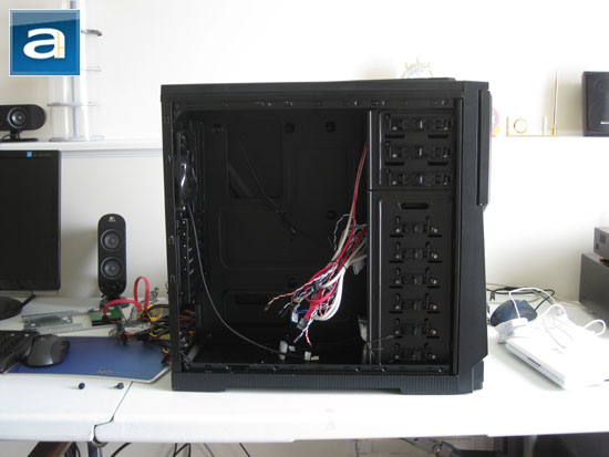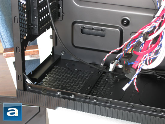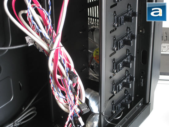 When it comes to cabling, Thermaltake did not pay a huge attention to make it as easy as possible for the end user. There is no room or any openings to let the user take the cables behind the motherboard tray. Fortunately for us, there is a huge gap behind the 3.5" drive rack -- you can take a peek at what I am talking about in the photo above, as well as the one preceding it. Experienced enthusiasts with good cabling skills should have no problems in managing excellent end results, and the ever modest Yours Truly will show you how it is done Installation section. That does not mean I would not appreciate a few integrated cabling guides in the case, however.