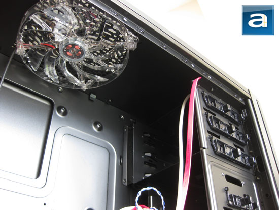 The Thermaltake Armor A90 features seven 3.5" drive bays to accommodate, well, up to seven 3.5" drives (Place 'Master of the Obvious' picture here eh). A 4-pin Molex powered 120mm LED fan draws cool air over the hard drives and into the system. By default, the fan is installed at the bottom, but there is an extra fan mount right above it. Each drive is placed in parallel orientation to the chassis, which is better for clean cabling, but may be a bit more challenging to add or remove drives down the road -- especially if you have excessively long video cards. Speaking of which, the longest video card you can fit in the Armor A90 is 10.5", meaning the latest ATI and NVIDIA flagships will need to find bigger home to live in. The top 3.5" drive bay is externally accessible, but does not feature tool-free installation. The lowest bay has four bumps at the bottom panel to take on one 2.5" hard drive or SSD.