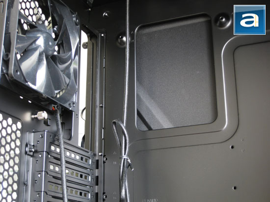 Keeping enthusiasts in mind, there are two more things in particular I want to cover. Firstly, you may be wondering what the thumbscrew is doing under the rear 120mm fan. If you didn't notice that earlier, now that I've got your attention -- the thumbscrew actually corresponds to a small clip on the exterior panel, used for clipping down cables such as those from your keyboard and mouse. This is used to discourage convenient theft of your expensive peripherals at LAN parties (For those on wireless, you are out of luck). I am also extremely pleased to find a large opening at the back of the motherboard tray for easy access to aftermarket heatsink backplates. You will find this feature absolutely priceless down the road, since it eliminates the need of removing your entire motherboard just to install a processor cooler later on. The tallest cooler you can fit in Thermaltake's Armor A90 is 163mm according to the manufacturer; you will have no problems with high performance units like the Noctua NH-D14. The funny thing is that the company's Frio CPU heatsink is 2mm over the clearance limit according to specifications, but Thermaltake actually has that cooler shown inside the Armor A90 quite a bit for their promotional material. I have installed the Frio in the system with no clearance issues anyway.