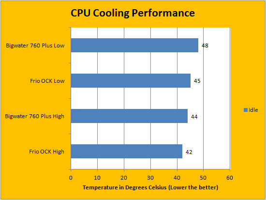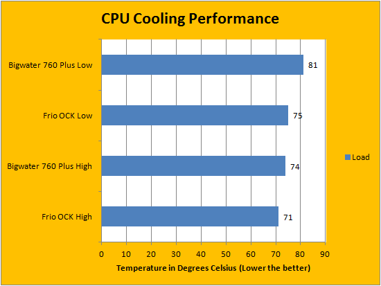 During the idle tests, I have noticed at start up, the Bigwater 760 Plus was running a very cool 30 degrees for a short while. But as the system continued to run, I had to wait quite a while before the temperature balanced out at 44 degrees at full fan speed. This wasn't surprising, as the liquid cooling system takes longer to heat up compared to a heatsink. What did surprise me was how it was, uhh, almost -- yes, you read that right -- almost as cool as the Frio OCK on its lowest fan speed. With only a single degree deference, it was definitely not impressive for the amount of noise being generated by the Bigwater 760 Plus. Getting the Frio OCK roaring at full fan speed, it was running noticeably cooler then the liquid cooler. Of course idle tests are not really the selling point for any cooler. Therefore, next up are the load tests.