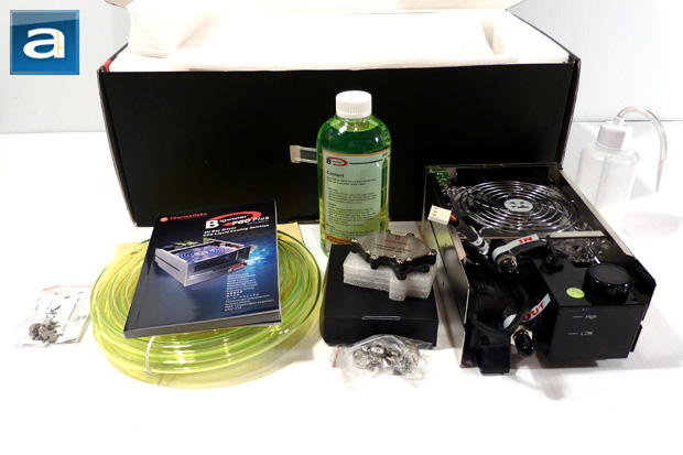 Below the top layer, you will find the liquid coolant bottle containing Propylene Glycol, which has many applications, but today it will be used as the main ingredient in the coolant for the liquid cooling system. There is also a convenient squeeze bottle for handling the coolant safely, which is odd, because Propylene Glycol has a low toxicity. Also, on the bottom layer of the box, you can see the radiator, pump, liquid tank, and mounting bracket all put together for you. This is very handy, because it greatly reduces the amount of work required for the consumer when installing the water cooler. Additionally, you can find the water block packaged away with extra padding. I don't really think the extra Styrofoam padding is necessary, but it does keep the water block in place during transit. Finally, there is the black box; this box contains all of the required parts for mounting the water block to your motherboard. I have to say this is quiet a large number of parts, but as with a liquid cooling kit, it is expected to have more parts in it than an air cooler. Well, now that we know what we got ourselves into, let's take a closer look at the details.