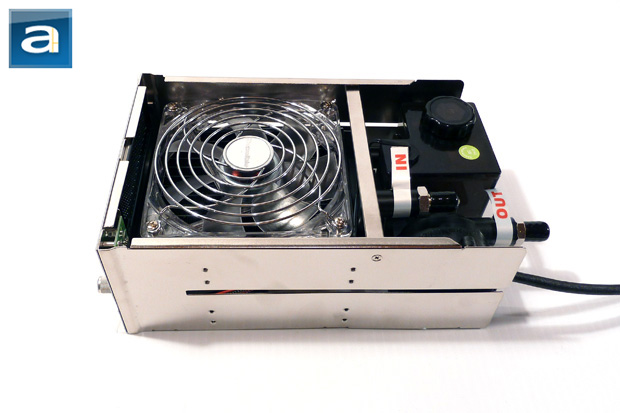 The 120mm fan that comes with the Thermaltake Bigwater 760 Plus offers plenty of airflow. However, it proves to be very loud at full speed, so you might not want to run it on the highest setting. The design of this cooling solution allows for the fan to be easily swapped out with a different model. This could be when the fan wears out, or you happen to own a different 120mm that you prefer to use in your setup. Either way, this is a great design consideration. The next component of this dual drive bay design is the liquid tank, which I find to be a bit smaller than it should be, but 130cc (130mL) is a fairly respectable amount. The liquid level label on the tank is very handy when you are looking inside your computer case. It allows you to quickly look to see if you need to refill the tank without waiting for the front indicator to turn red. The refill hole is located at the back of the bay drives, which is very handy, because you can easily refill without having to remove the system from your computer. Additionally, the hole is air-tight to ensure it will not leak during operation -- something you would expect from a water cooling system. Finally, the last part of this component is the pump itself, offering a maximum flow rate of 500L/hr. This should be more than sufficient for a CPU cooler, with plenty of power to boot. I was a bit surprised at the 80,000 hour lifetime on the pump, as many other liquid cooling pumps don't typically offer that high of a lifetime rating. I certainly won't be able to validate if that number is accurate for this review, so I'll also have to take Thermaltake's word on it.