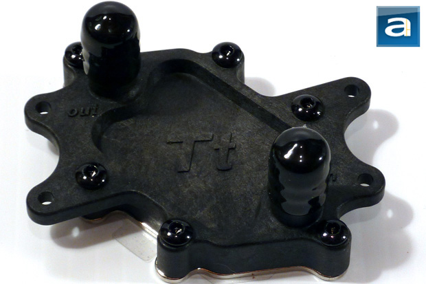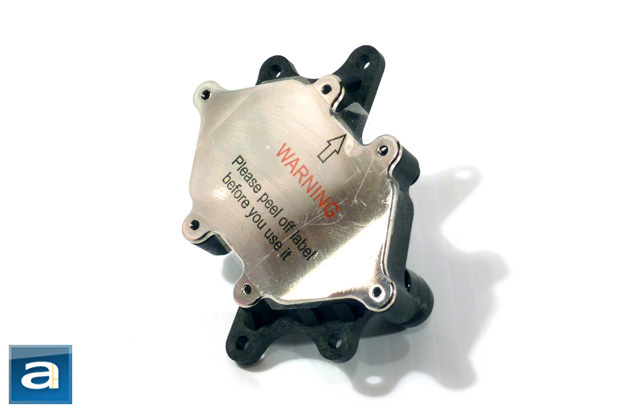 The last and probably most important part of this whole system is the water block, or as some call, the cooling block. Being made out of copper, it offers the highest level of thermal conductivity for metals of the price range, and is nickel plated to be corrosion resistant. While extremely high-end blocks may be gold or silver plated instead, they do not come cheap. Instead, many high-end blocks are nickel plated, because corrosion is a major problem down the road for pure copper metal contacts. The cooling block provided by Thermaltake's Bigwater 760 Plus attaches very securely to the mounting bracket, and is labeled with input and output connectors. When looking at the design on the inside, you will find it has a number of fins that allows for a large surface area to transfer heat from the processor to the fluid. While the size of this is fairly small, it looks like it should provide a reasonable cooling performance. Overall, it appears the parts are relatively decent and nothing seems to be completely unusual. This means it is time to go over the installation process.