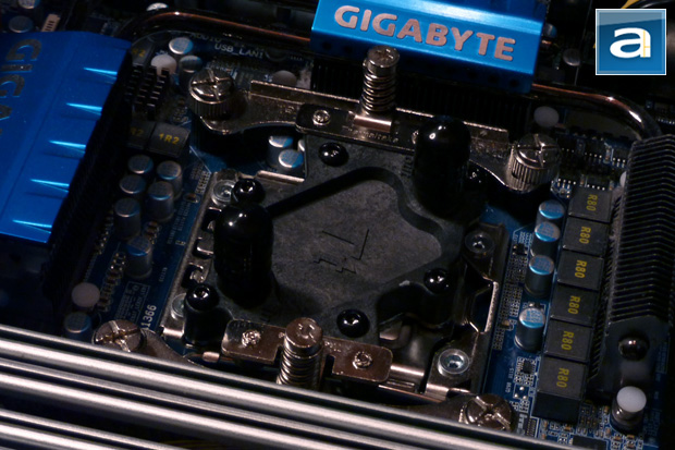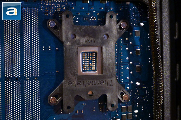 Obviously, the first task for installation is removing the old cooler, and cleaning off the processor. Of course, before running the system with liquid inside of your computer, you should always test it outside, just in case. The last thing you want is come coolant to be spilling onto your hardware, unless you enjoy shorting it out and damaging your computer. I haven't met someone like that yet, so I'm going to stick with running a test outside of the system first. Installing the backplate and front brackets was a fairly easy task that didn't require anything out of the ordinary. I really do like the design for the backplate, and the ability to read the brand for which type of socket you are installing for. This really eliminates any doubt about what you are doing when installing the backplate. However, the mounting bars do not have any grooves for aligning the screws when securing them to the motherboard. I really don't like this, and find it rather irritating this issue has still not been addressed by Thermaltake. While it is a minor issue, proper alignment is always recommended, and without grooves, you can easily be off without noticing.