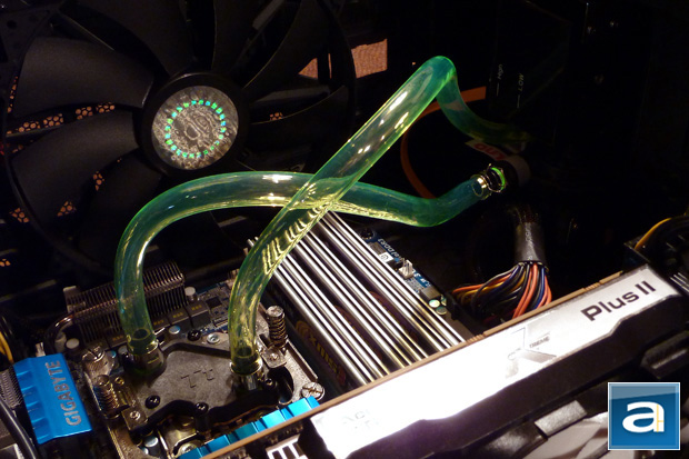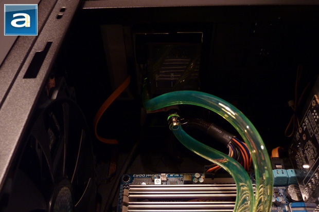 First thing that needs to be done is fill up the coolant tank. Next, you will need to power the pump, so that it can fill the tubes. While it is pumping, you need to continue to fill the coolant tank until there is no air in the tubes, and the tank level is at its maximum level. The very first thing I noticed about the system when I turned on the pump is that the coolant was flowing extremely fast, in fact, it was probably flowing too fast. The issue with the fluid flowing too quickly is that it doesn't allow enough time for heat to transfer from the water block to the fluid. After letting the system run for a few minutes, and seeing that no parts were leaking, I powered it down and transferred it into my computer. Applying a thin layer of thermal paste provided, I secured the water block down, and screwed in the dual drive bays. The only thing left is to test it out and see how well it performs against an aftermarket air cooler... the Frio OCK from Thermaltake themselves.