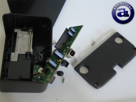 Removing the cover of the Thermaltake BlacX reveals two primary components inside the docking station -- of which one is a PCB, and the second is a large metal weight. The simple green PCB facilitates the necessary controllers and components such as the SATA to USB bridge, in which we'll look at in a second. Four wires connect to the PCB for two LEDs as previously described.